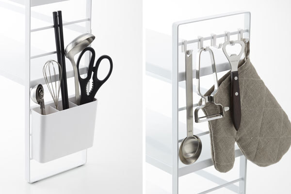 ラック横には付属のカトラリーポケット(写真左)やフック5個(写真右)を取り付けられるので、キッチン小物をパッと取り出しやすく引っ掛けておくことができます。