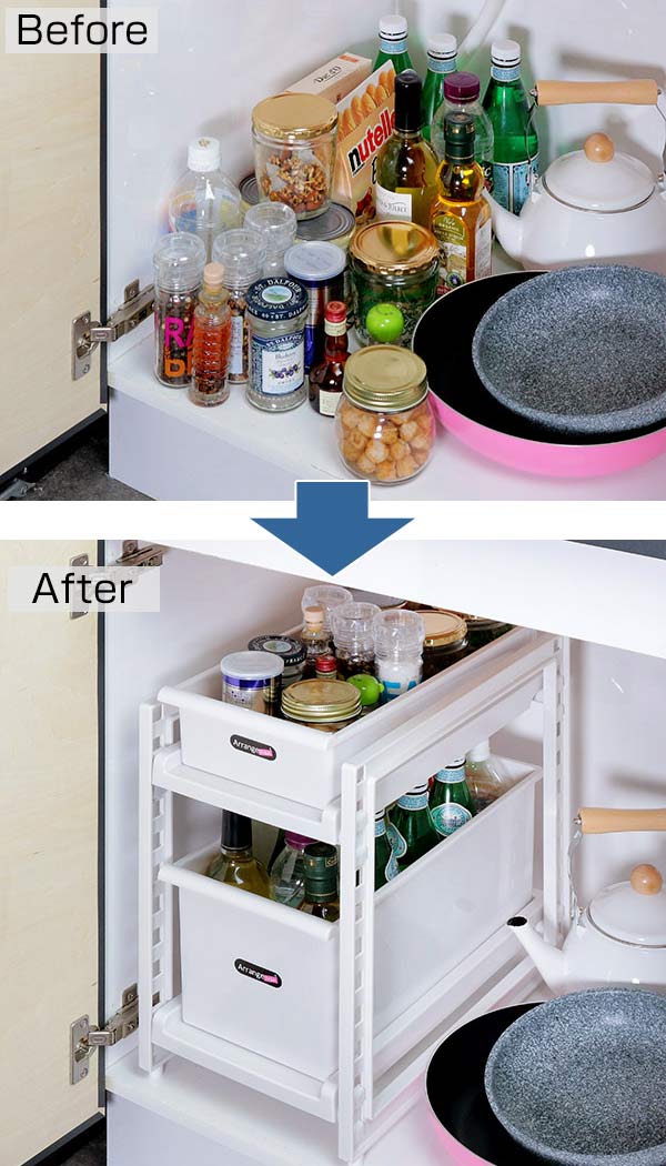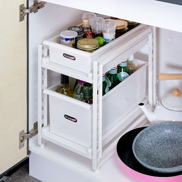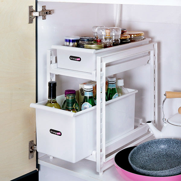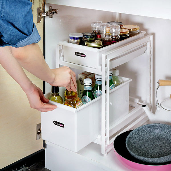 シンク下のスペースを奥まで無駄なく有効活用できる2段ストッカーです。普段のお料理によく使う調味料から洗剤などのストックまで上段と下段で分けて整理できます。キッチンだけでなく洗面台の下やクローゼットなどあらゆる場所で便利に使えます。