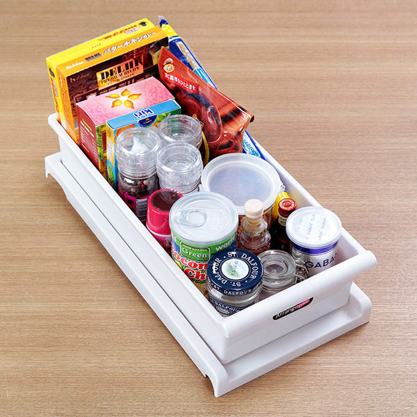 調味料の出し入れに便利なスライド式です。奥に置いた物も見つけやすくサッと取り出せるから使い忘れて賞味期限が切れてしまったり無駄に買い置きしてしまうことなく経済的です。