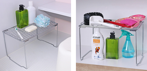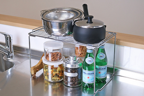 作業スペースで調味料やキッチン小物を置いたり、シンク下で鍋やフライパンなどの調理器具を収納したり、様々な用途で自由にお使いいただけるラックです。