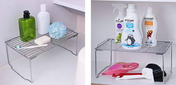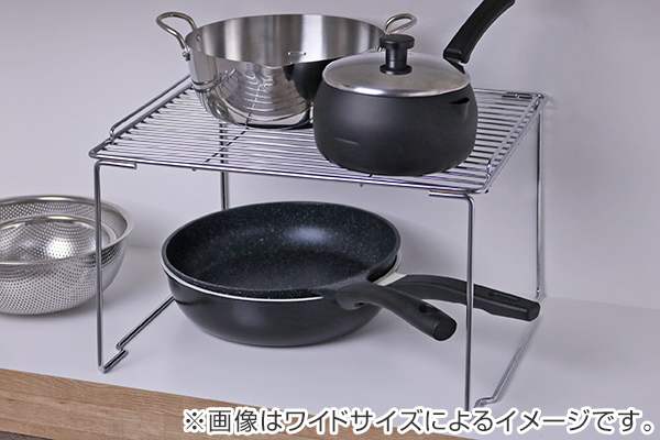 作業スペースで調味料やキッチン小物を置いたり、シンク下で鍋やフライパンなどの調理器具を収納したり、様々な用途で自由にお使いいただけるラックです。