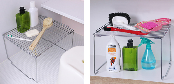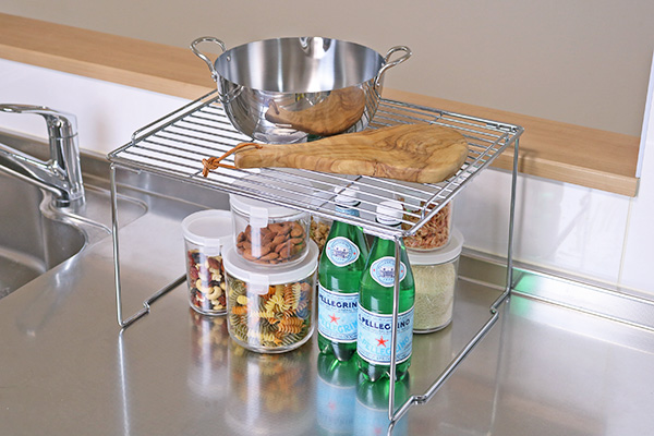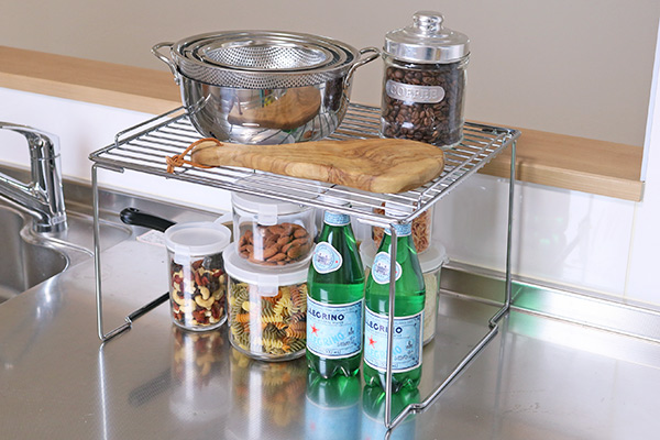 作業スペースで調味料やキッチン小物を置いたり、シンク下で鍋やフライパンなどの調理器具を収納したり、様々な用途で自由にお使いいただけるラックです。