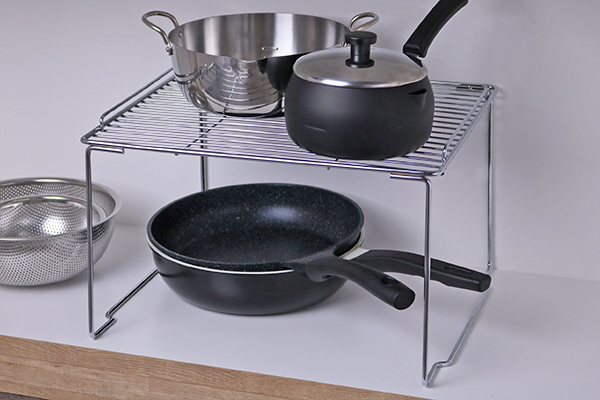 デッドスペースが生まれがちなシンク下の収納スペースに棚をプラスすることで、鍋やキッチン道具をすっきり収納することができます。スタッキングもできて、扉の中の縦の空間を効率よく使えます。