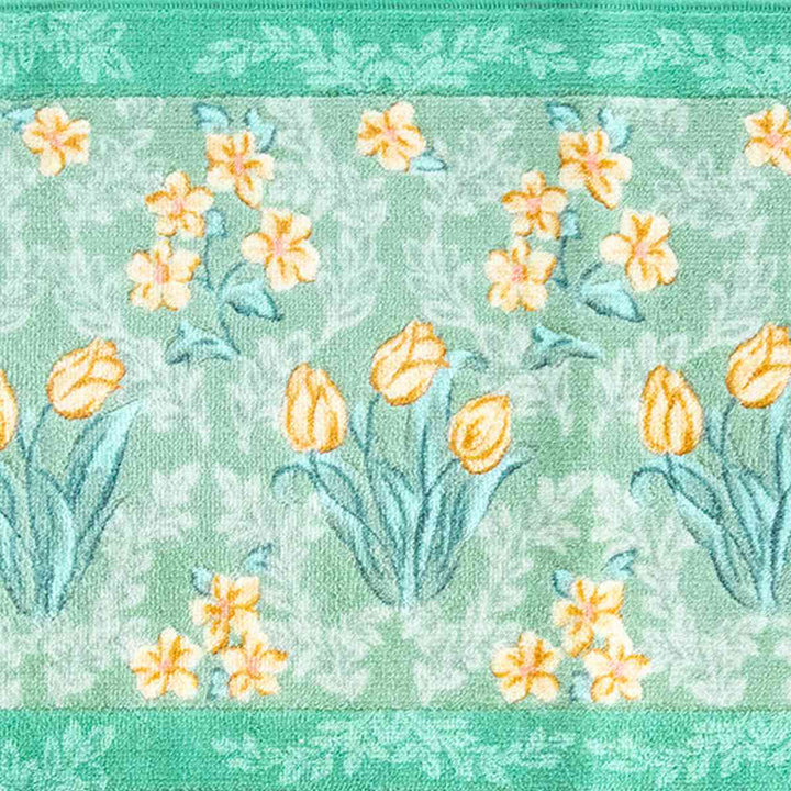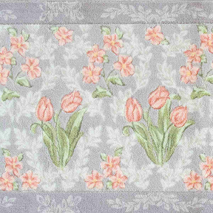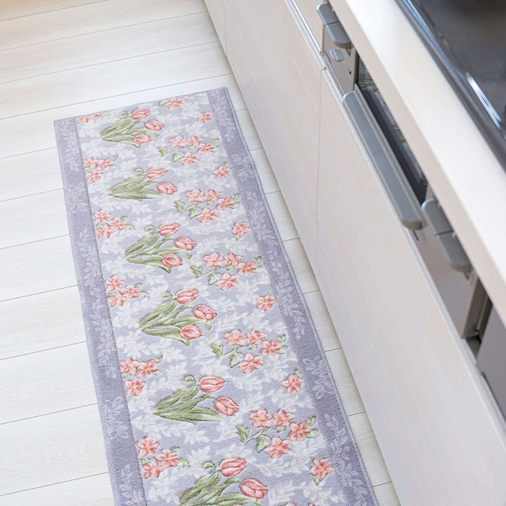 アール・ヌーボー(植物モチーフや曲線を多用した装飾性の高いデザインの潮流)がキッチンマットに取り入れられています。柔らかな曲線で花柄を表現し、地模様にはクラシックなオーナメント柄が描かれています。エレガントさにあふれ、上質で洗練されたマットに仕上がっており、お部屋に1枚置くだけでお洒落な印象になります。