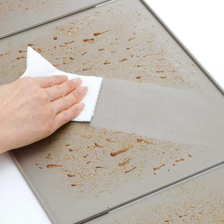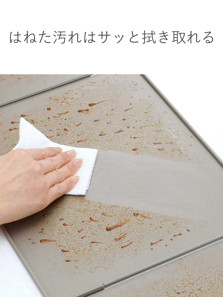 表面には油汚れなどがこびりつかない加工が施されています。レンジガードに付いた汚れはサッと洗う、または拭き取ることで落とすことができるので、お手入れが簡単です。