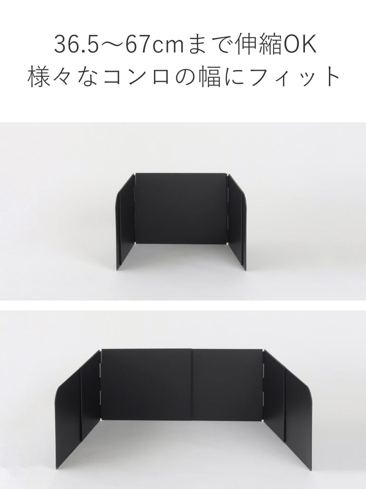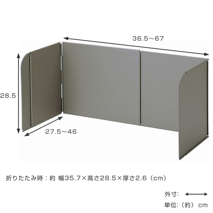 レンジガードの背面は36~65cmまで、両サイドは27.5~46cmまで伸縮させることができます。ご自宅のコンロに合わせて調節をしてください。使わない時はたたむことも可能です。約2.6cmとスリムな厚さになるので、ちょっとした隙間に収納できます。