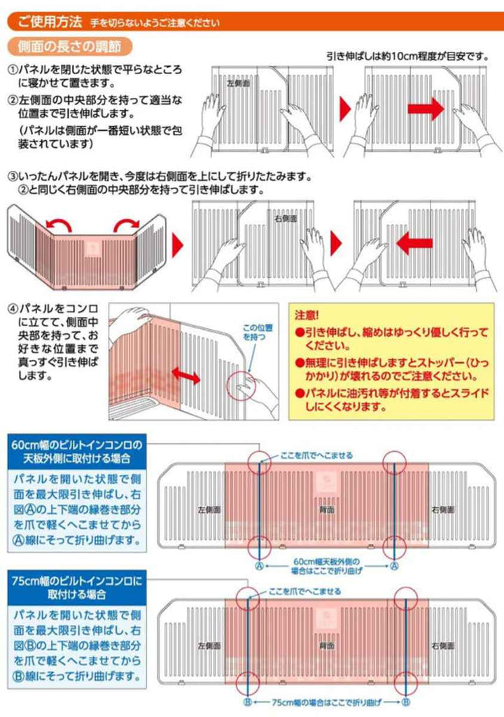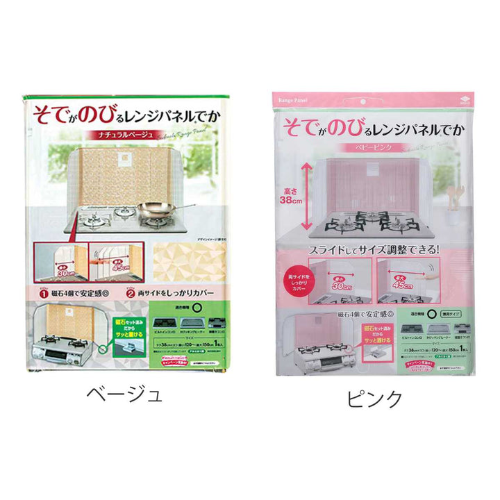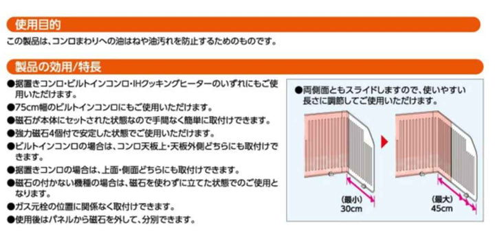 スライド機能付きで、両そでの長さを30~46cm調節ができます。コンロを広く使いたい時や、掃除の際に縮めることができ便利です。