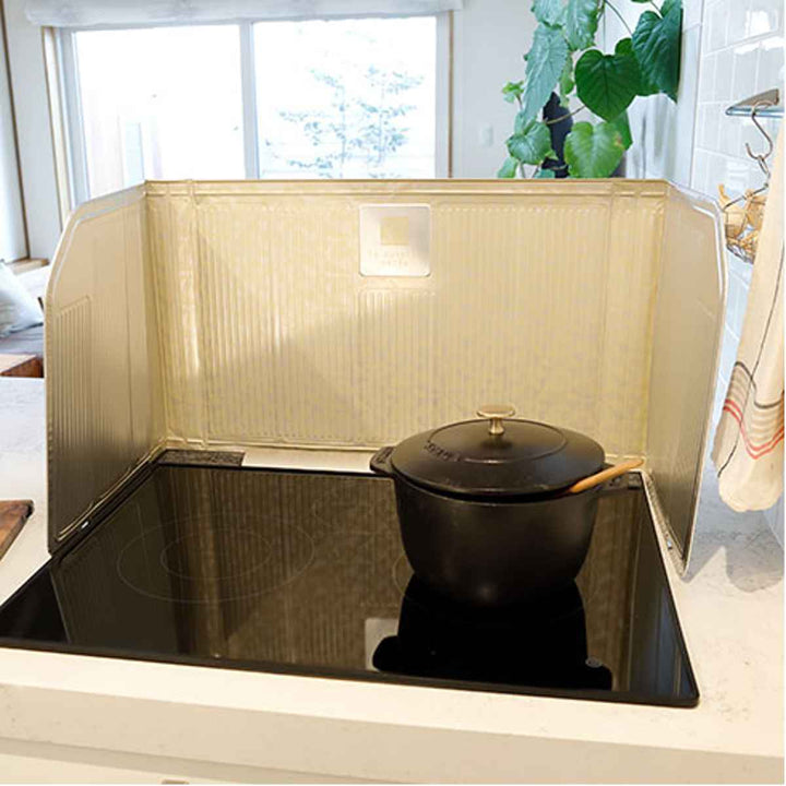 そでの長さを調節できる「そでがのびるレンジパネルでか」です。コンロ周りの油はねや油汚れをワイドに防止します。ガスの元栓位置を気にすることなく設置できるのも嬉しいポイントです。