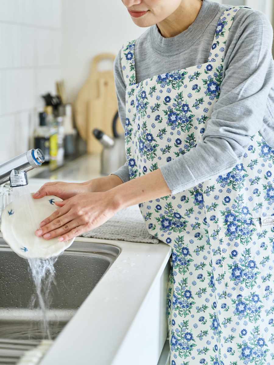 生地にクイックドライ加工を施した、速乾タイプの機能エプロンです。水に濡れても干しておくだけで次の着用時までにしっかり乾き、いつでも快適にお使いいただけます。忙しい方に嬉しい一枚です。