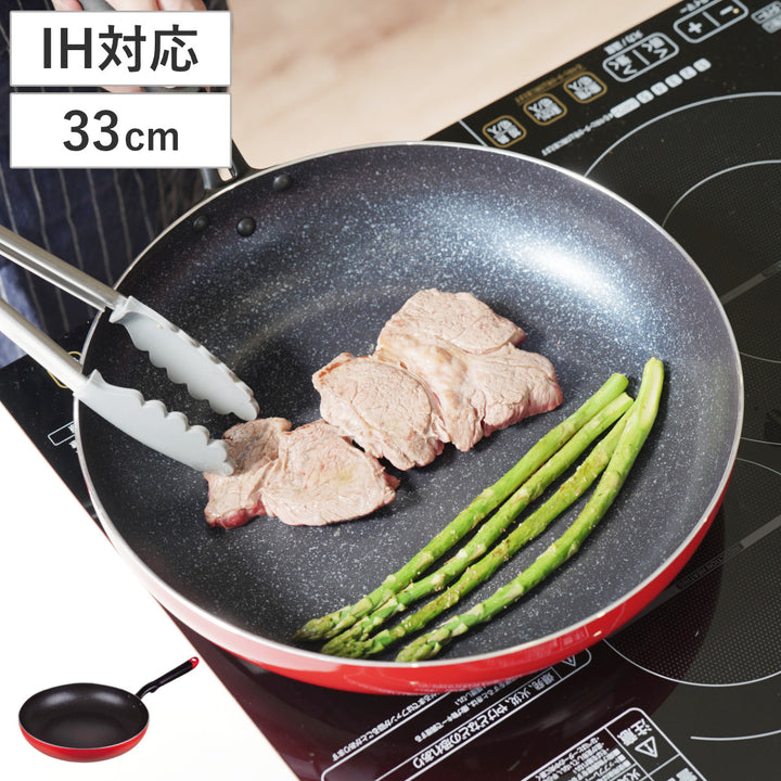 直径33cmの超ビックサイズのフライパンです。内面は優れた耐久性でキズに強い、ダイヤモンド粒子配合の内面4層構造のマーブルダイヤモンドコートで、金属ヘラも使えます。