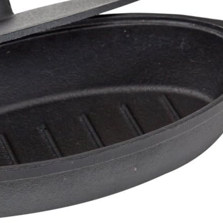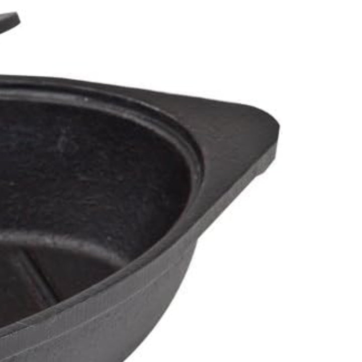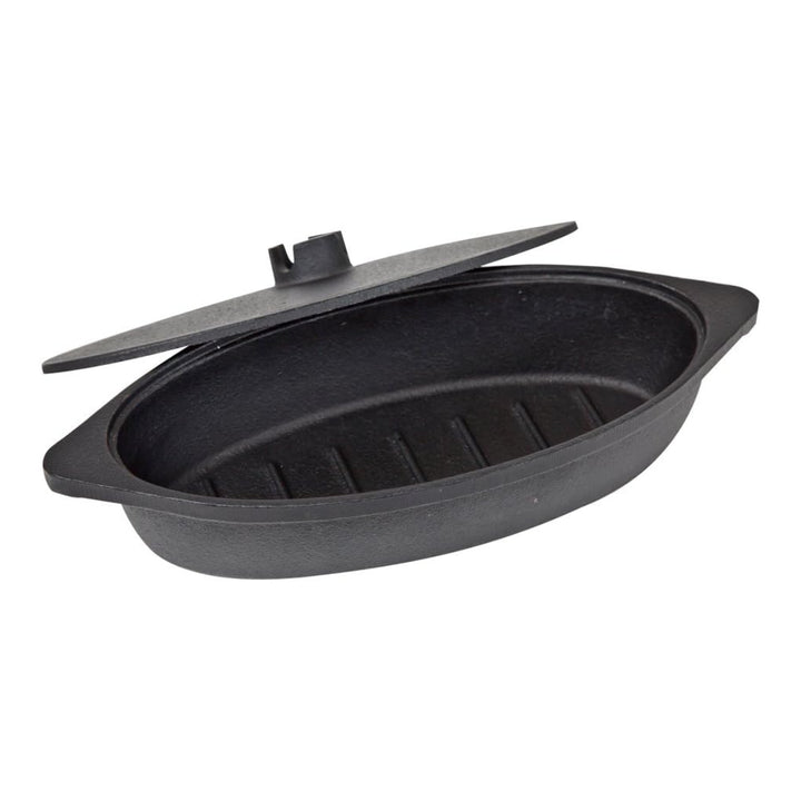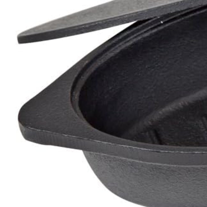 鉄製のフタ付きで、肉はもちろん野菜などの蒸し焼き料理にも便利です。フタのツマミにはくぼみがあり、菜箸を置くこともできます。