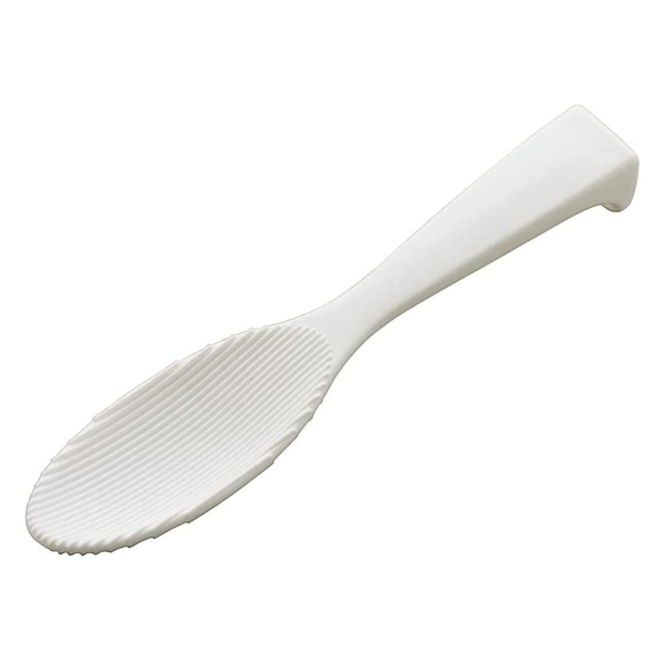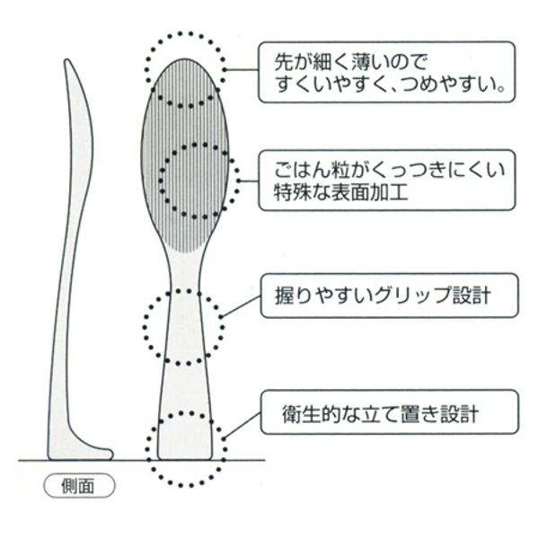 表面は、ごはん粒がくっつきにくい特殊な表面加工がされており、持ち手は握りやすいグリップ設計でごはんもすくいやすくなっています。また立て置きができるようになっているので、よそう部分が調理台やテーブルなどにつかず衛生的です。