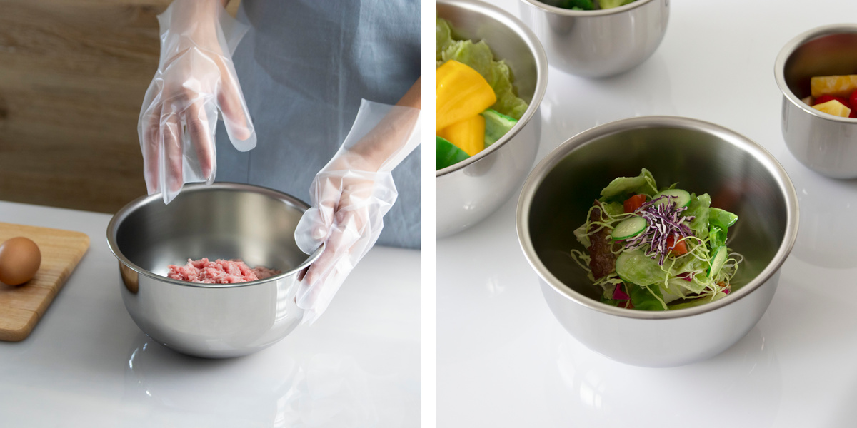 深さがあるので、和え物や調味料など液体も混ぜ合わせやすく、水戻しなどにも便利です。また、フチを持って作業できるので、安定してかき混ぜることができます。