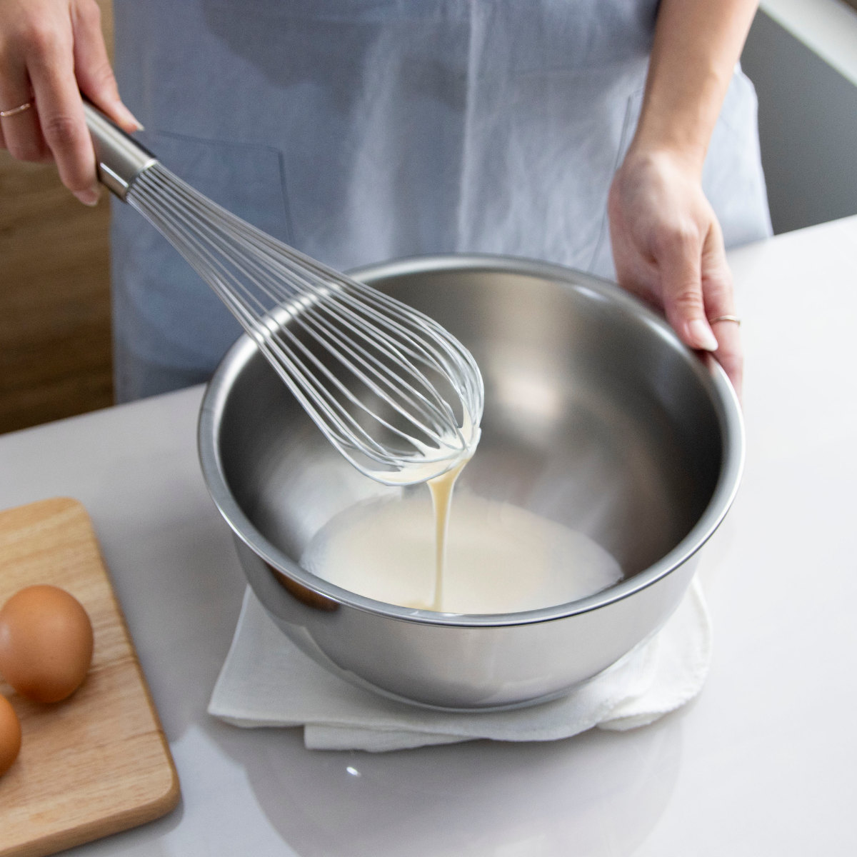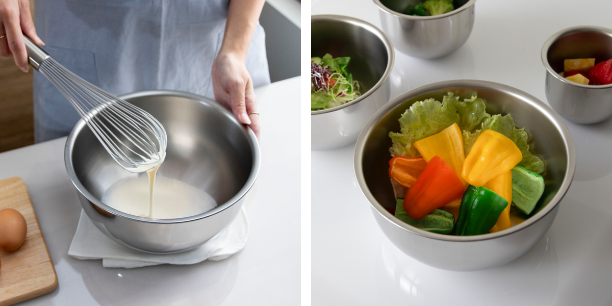 深さがあるので、和え物や調味料など液体も混ぜ合わせやすく、水戻しなどにも便利です。また、フチを持って作業できるので、安定してかき混ぜることができます。