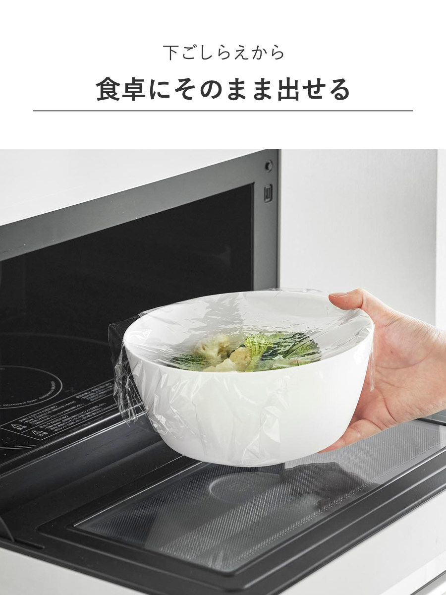 電子レンジで加熱できるので蒸し野菜や下ごしらえに便利です。そのまま食卓に出せるスッキリとしたデザインで洗い物を減らすことができます。調理をしてから食器として使えるボウルは幅広く活用できます。