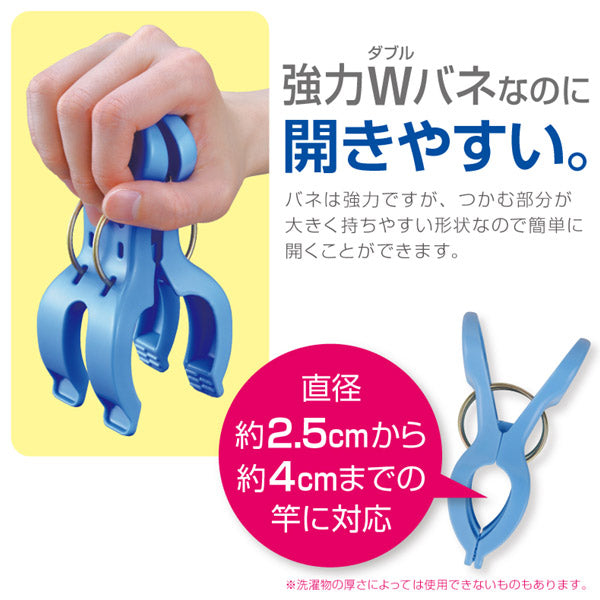 おすすめポイント 厚手の洗濯物をガッチリはさむ!ダブルの強力バネで厚い洗濯物をしっかりはさめる力持ちのピンチです。 市販の物干し竿(直径2.5〜4cm)対応です。 ※洗濯物の厚さによっては使用できないものもあります。