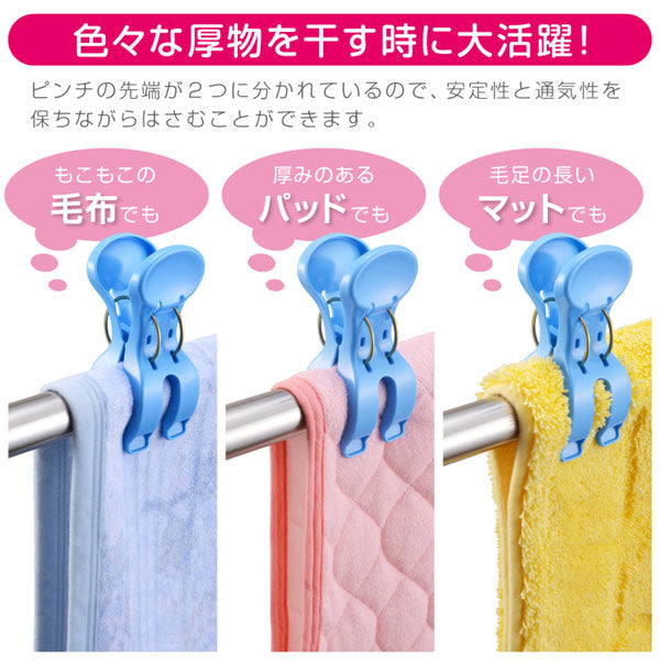 ●強力バネでしっかり挟むので、もこもこの毛布、毛足の長いマット、厚みのあるパッドなど、厚い物の乾燥に最適です。