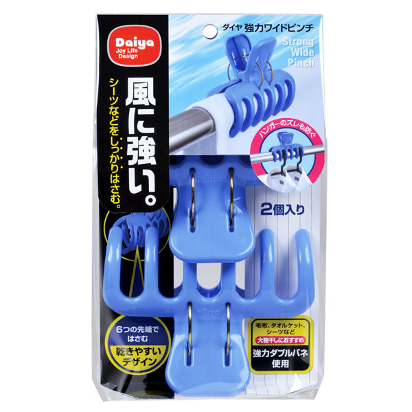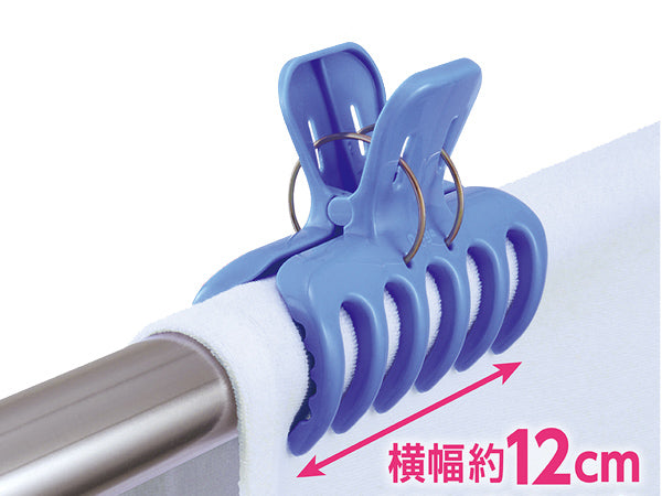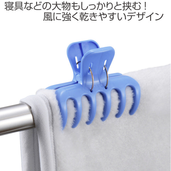 毛布やタオルケットなどの大物を干す時に便利な強力ワイドピンチです。6つに分かれた先端と強力ダブルバネで、大物もしっかりとはさみます。風が強い日でも安心して干すことができます。