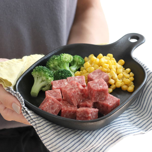一人分のグラタンやドリア、2〜4人でシェアするホットサラダや焼き料理、ケーキにも便利な大きさと形です。まるでスキレットのような無骨なシルエットの耐熱皿は、手軽におうちでアウトドア気分を味わえます。