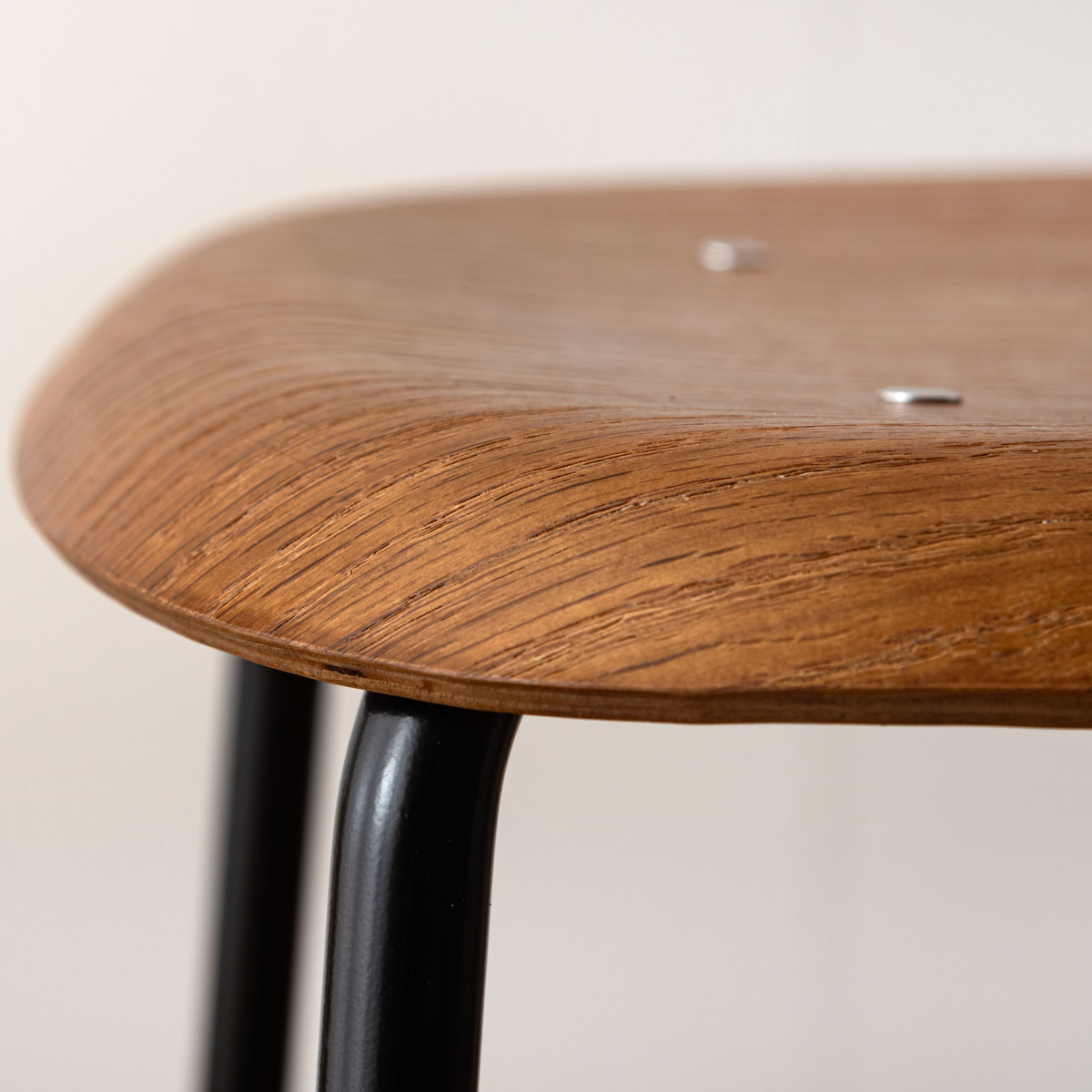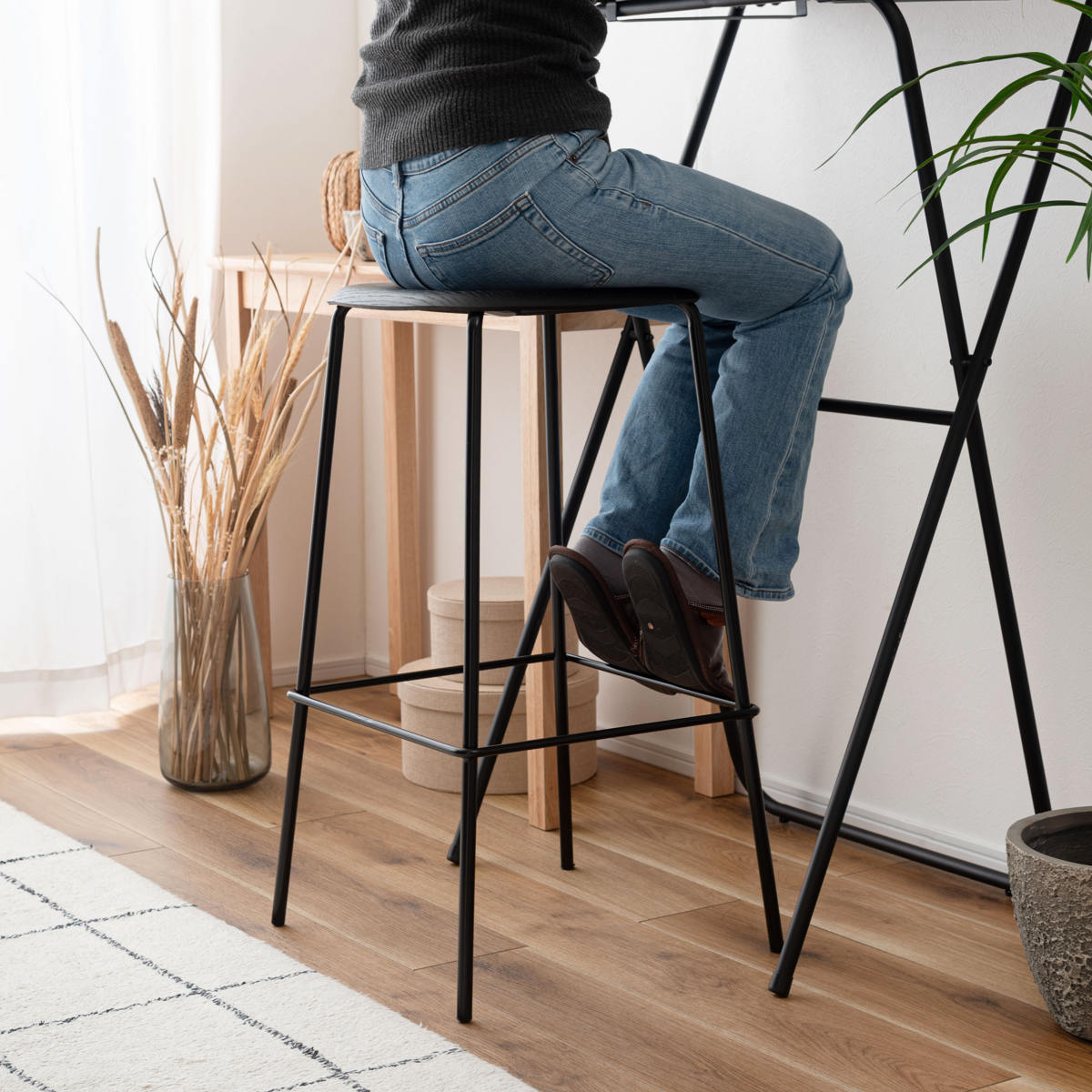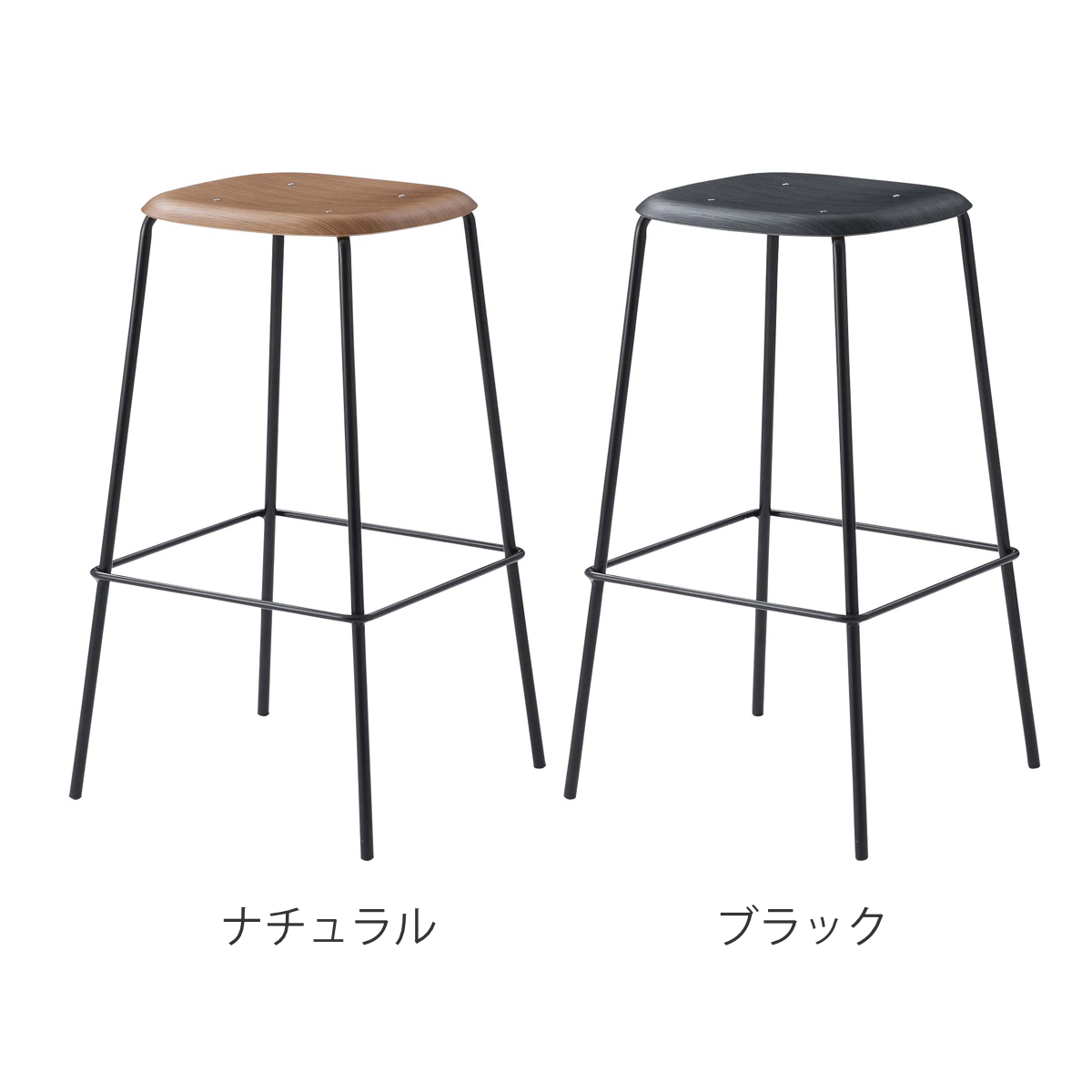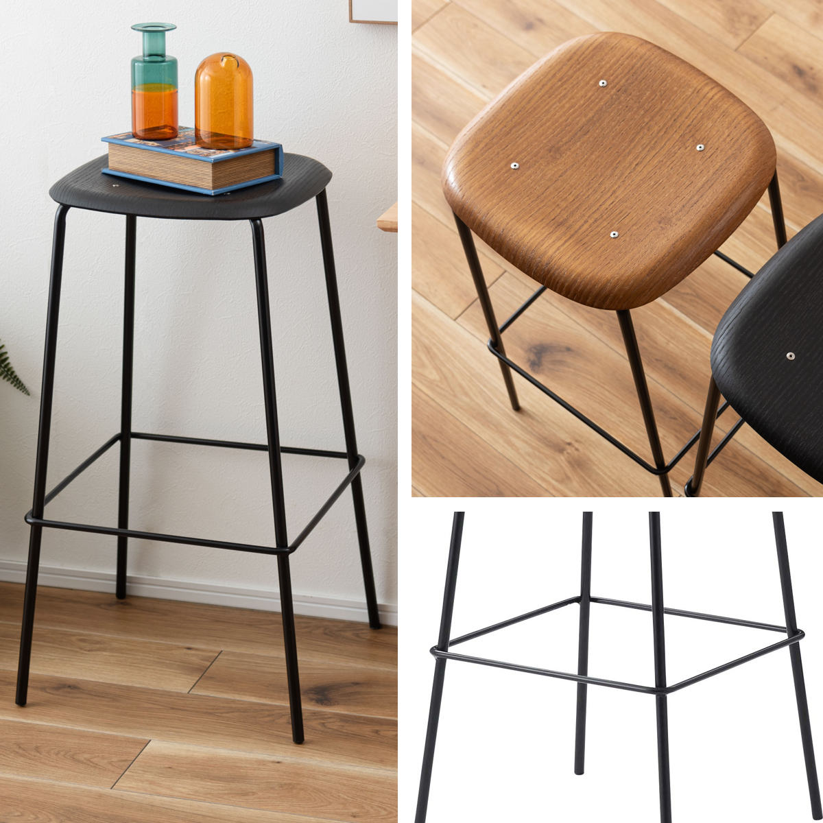 無駄な装飾のないシンプルなデザインの板座タイプのハイスツール。座面下から伸びたスチール脚の細めのラインと四角形に描かれたステップがスタイリッシュな印象です。