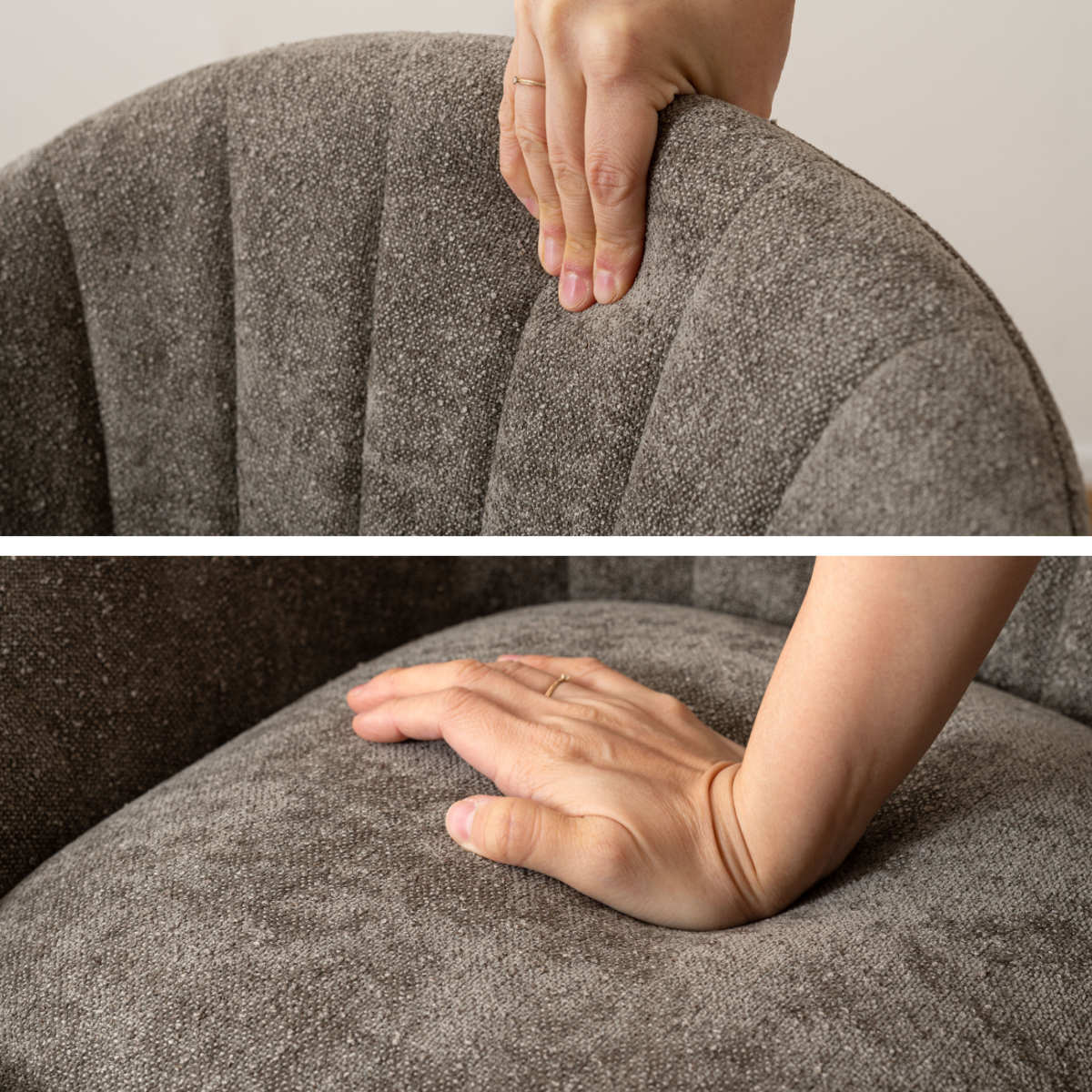 コロンと丸い背もたれは身体にフィットして包み込んでくれます。安定したホールド感でずっと座っていたい心地よさです。