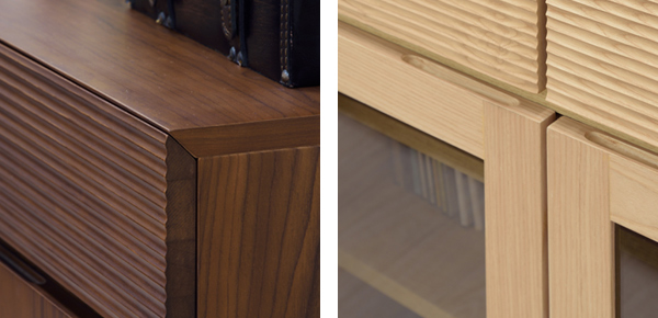 引き出し全体には優美な枯山水を思わせる筋彫りが施されています。角を斜めにカットすることでシャープな印象に仕上げています。
