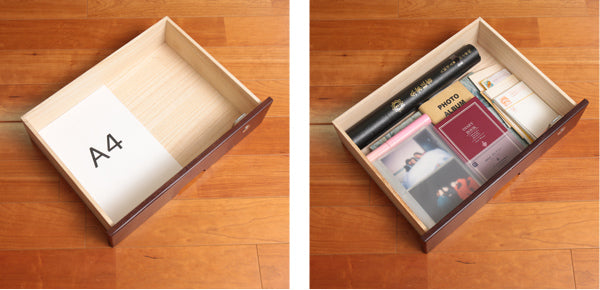 ●幅が広い引き出しなので、たっぷり収納することができ、書類整理などにも丁度いいサイズです。