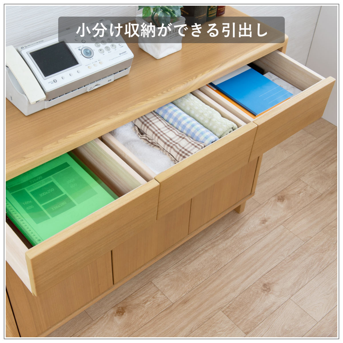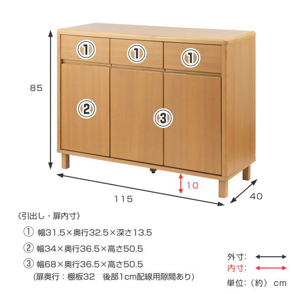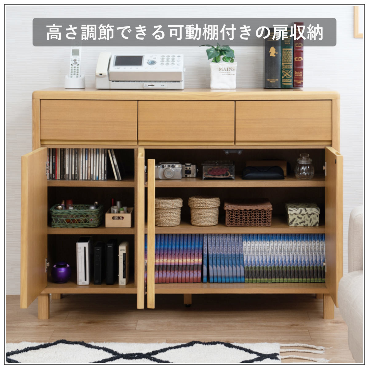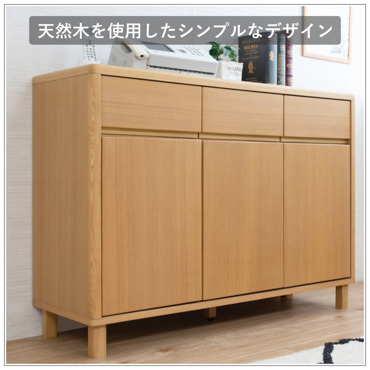 キャビネット幅115cm3枚扉引出し付天然木タモ材
