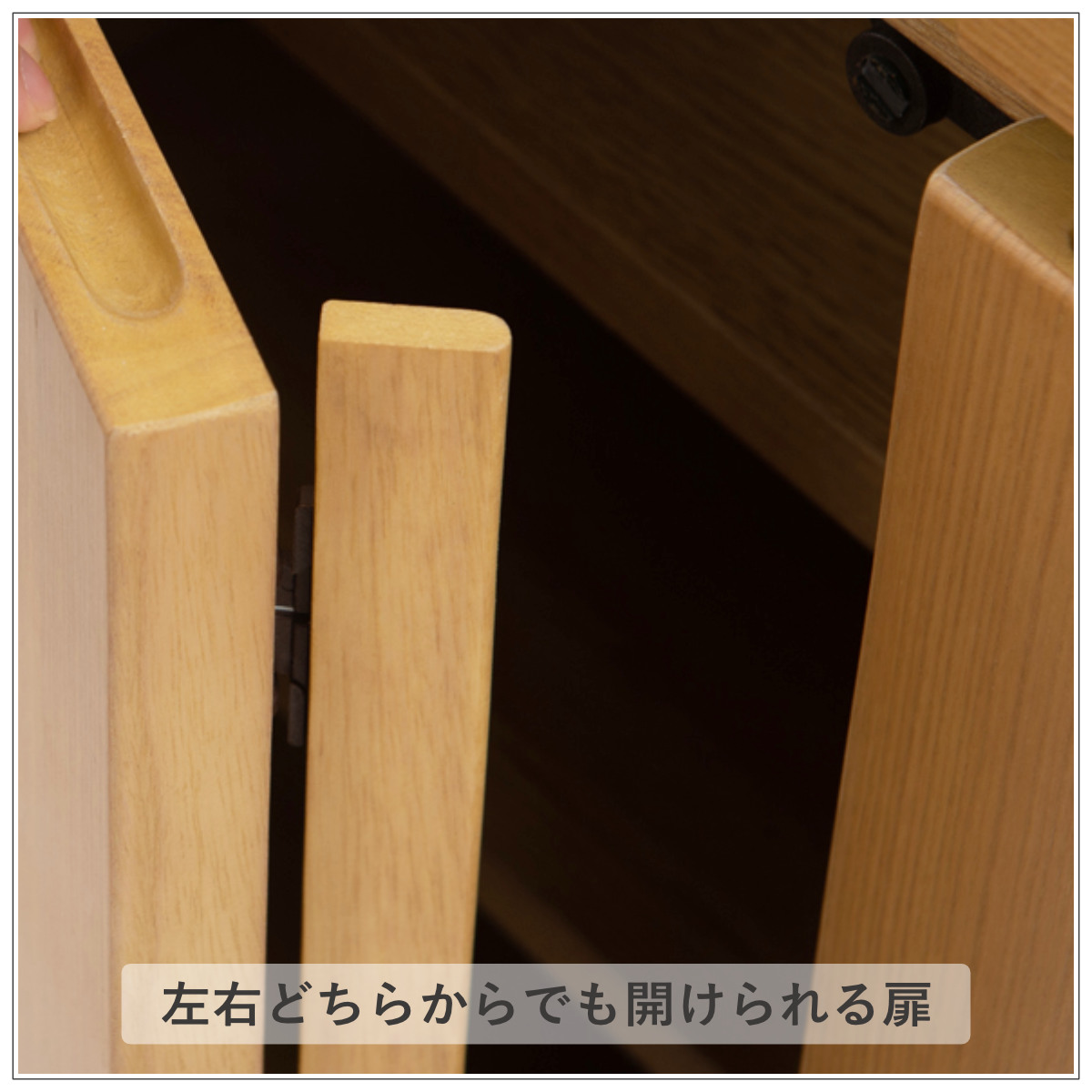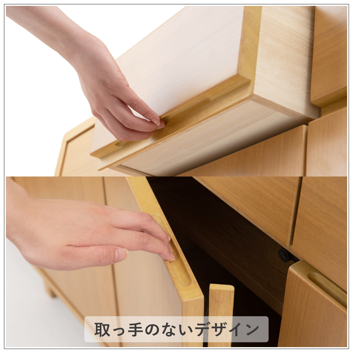 取っ手の無いすっきりとしたデザインで、引出し下部と扉上部には掘り込みが入っているので開閉がしやすいです。