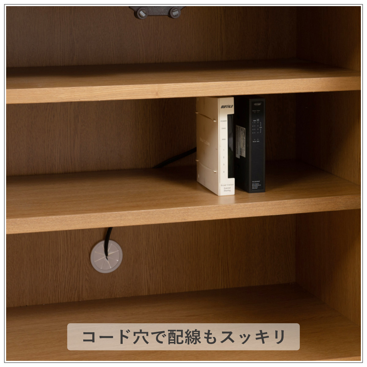 背板に配線穴加工を施しているので配線を通すことができ、ルーターや電子機器類を隠して収納ができます。また、棚板の後方に隙間を開けているので、棚板をまたいでの配線も可能です。