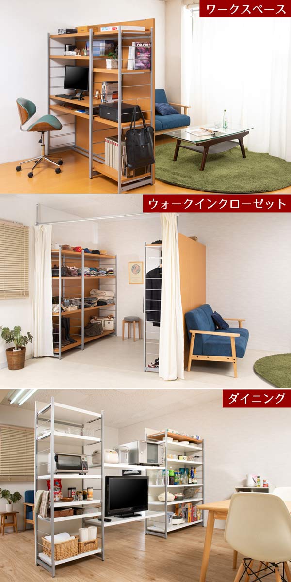 大掛かりな工事をすることなく簡単に間仕切りができるため、賃貸住宅にお住まいの方や子供の成長に合わせてお部屋をアレンジしたい方にお勧めです。ラックを並べてご使用になるときはジョイント金具で固定できるため仕上がりもキレイです。