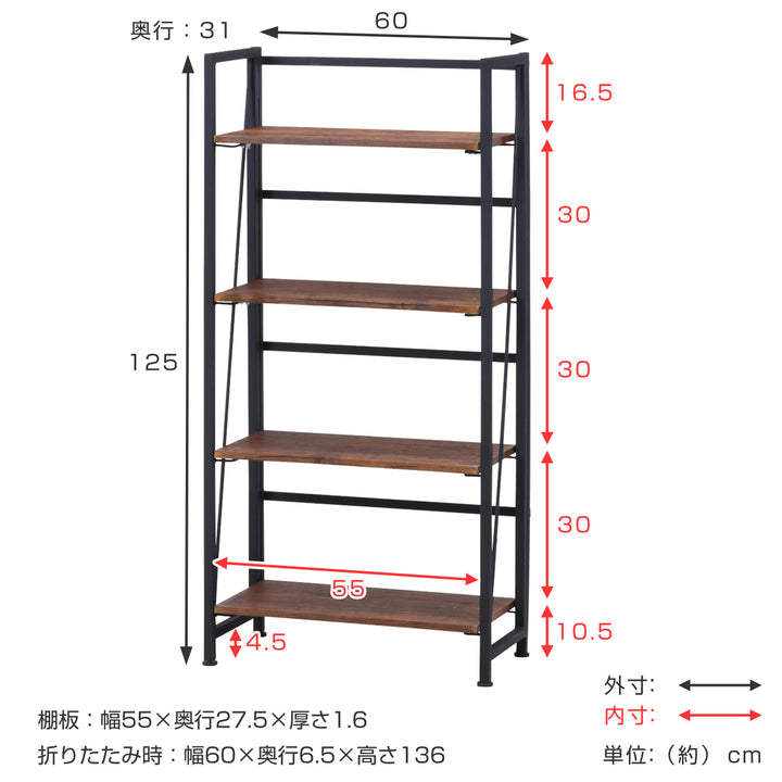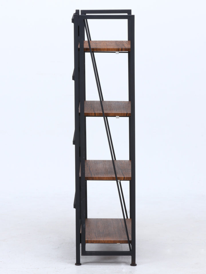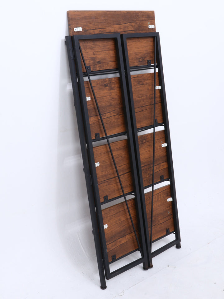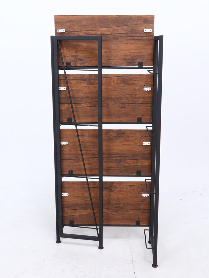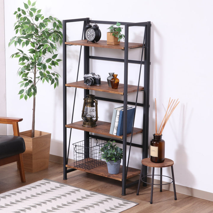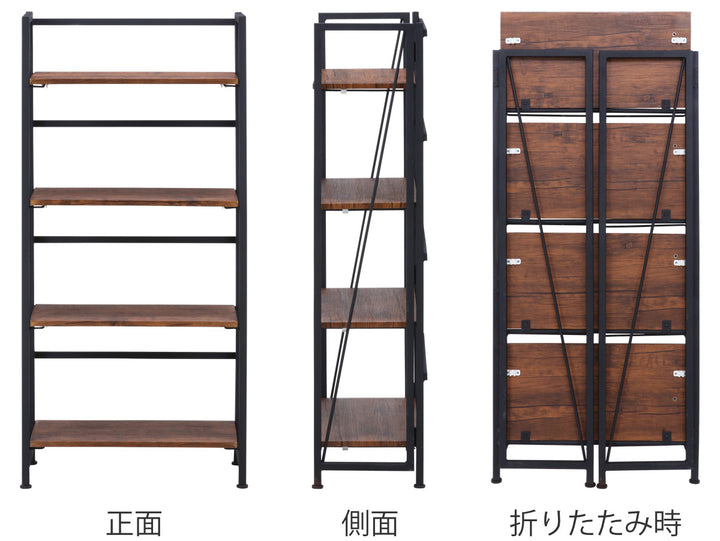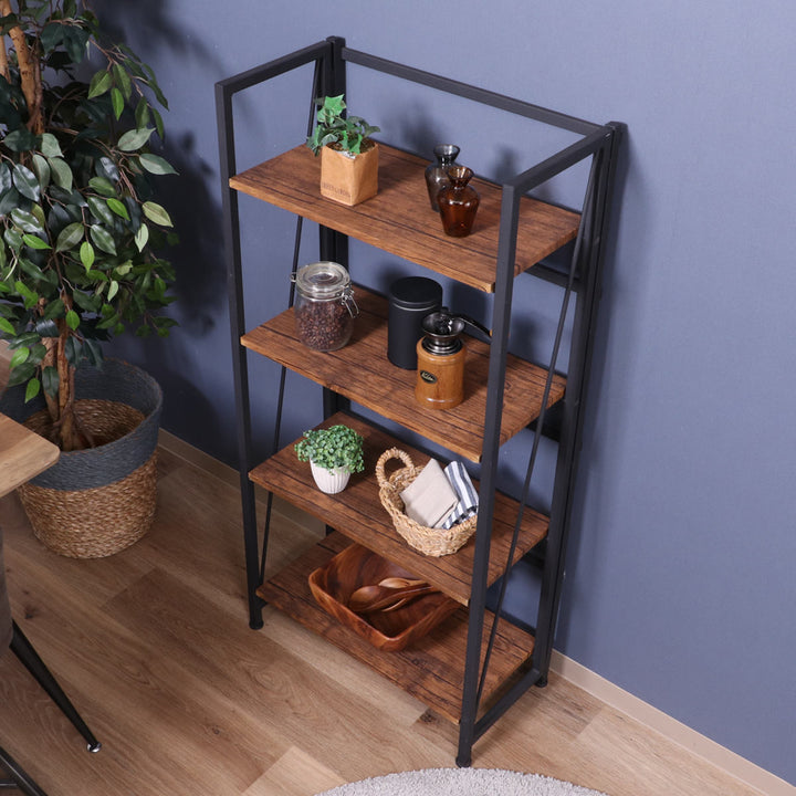 使わない時は折りたたんで収納できるフォールディングタイプの4段ラックです。オープン仕様で圧迫感を感じにくいので、空間を広く見せながら収納を増やすことができます。ブラックスチール×木目調のデザインは、お部屋のテイストを選ばずインテリアに馴染んでくれます。