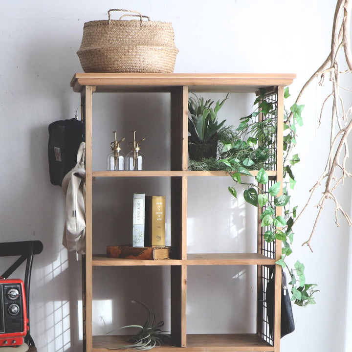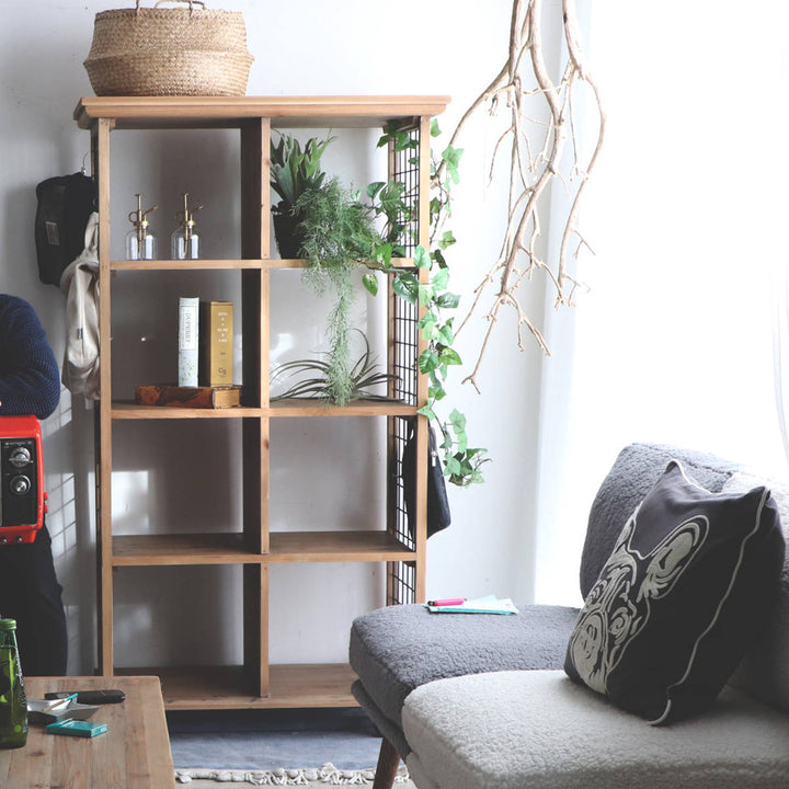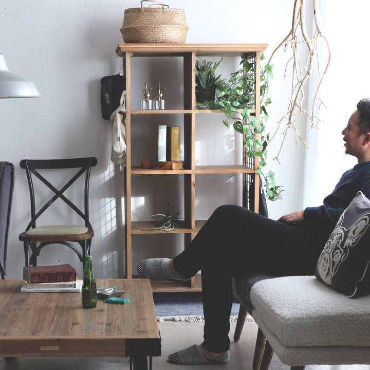 圧迫感が少ないオープン収納で、お部屋に合わせやすいシンプルなデザインのハイシェルフです。重厚感のある杉古材と無機質な黒スチールとの組み合わせは、無骨さもありつつ素朴な木の質感や温かみを感じられます。