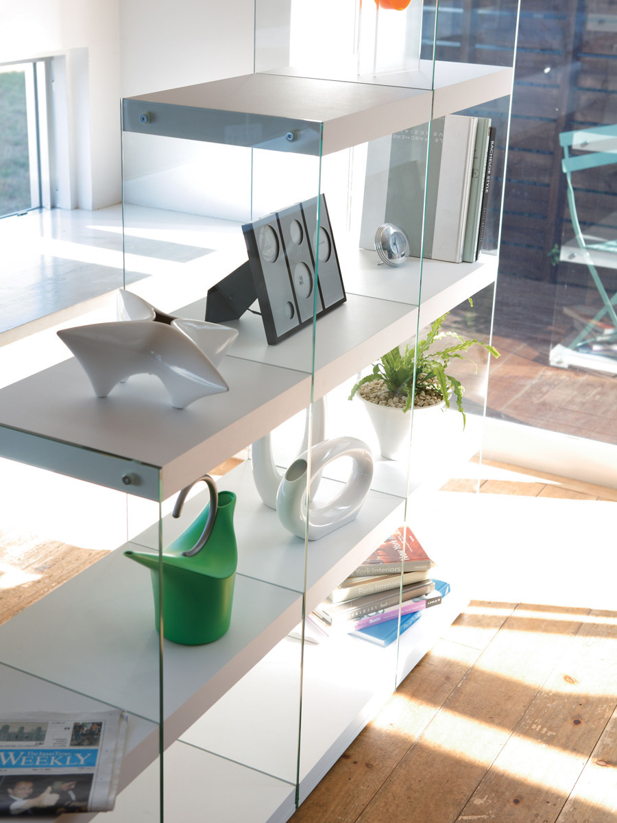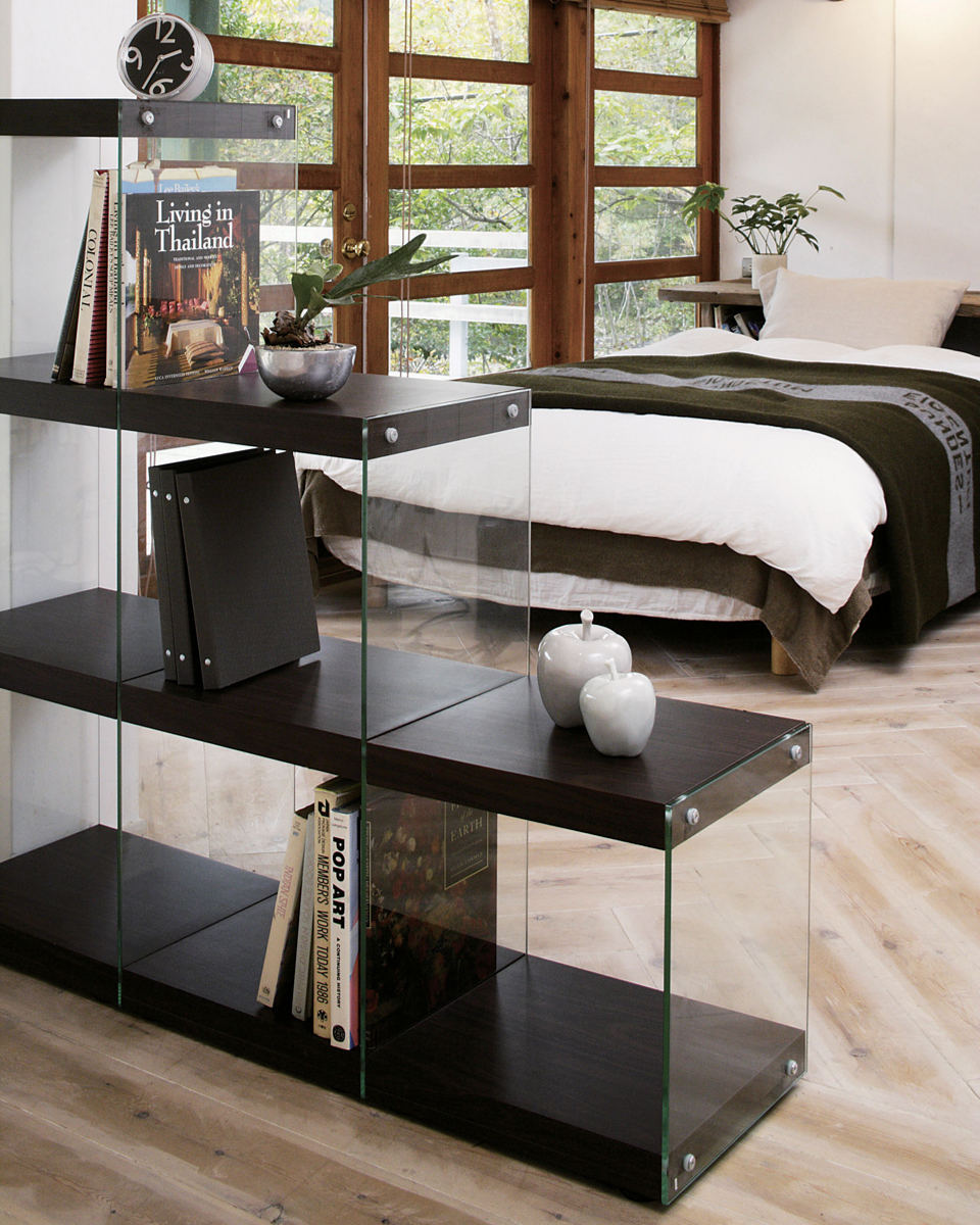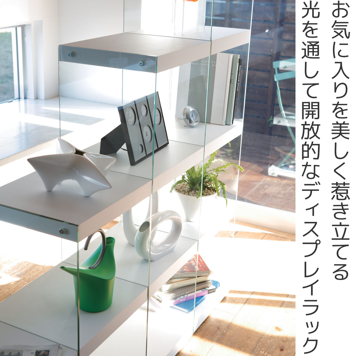側面にガラスを使用しているので、圧迫感がなくスッキリとした印象のディスプレイラックです。ガラスが光を通すので、雑貨や小物をより美しく惹き立たせます。背板がないので、間仕切り収納としてもおすすめです。