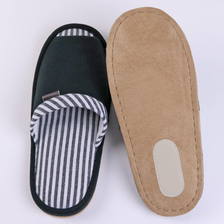 底面は床に優しくパタパタと音が鳴りにくいスエード生地を使用しています。かかとには滑り止め加工が施されているので、安心してお使いいただけます。