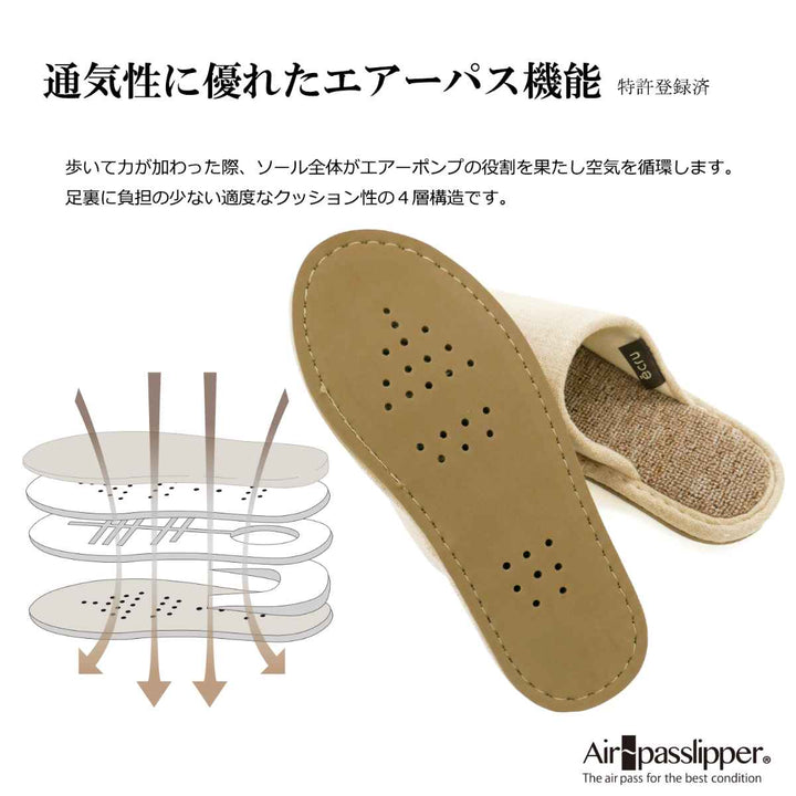 歩いて力が加わった際、ソール全体がエアーポンプの役割を果たし空気を循環します。足裏に負担の少ない適度なクッション性の4層構造です。また、底には滑りにくい加工のEVA樹脂を使用しているので、安心して使用出来ます。