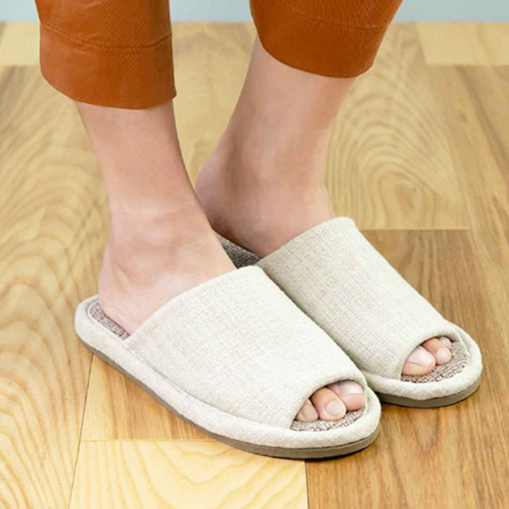 足裏部分には弾力あるパイル生地を使用しています。シンプルで落ち着きのある空間を演出してくれる、ソフトな肌ざわりが気持ちいいスリッパMサイズです。