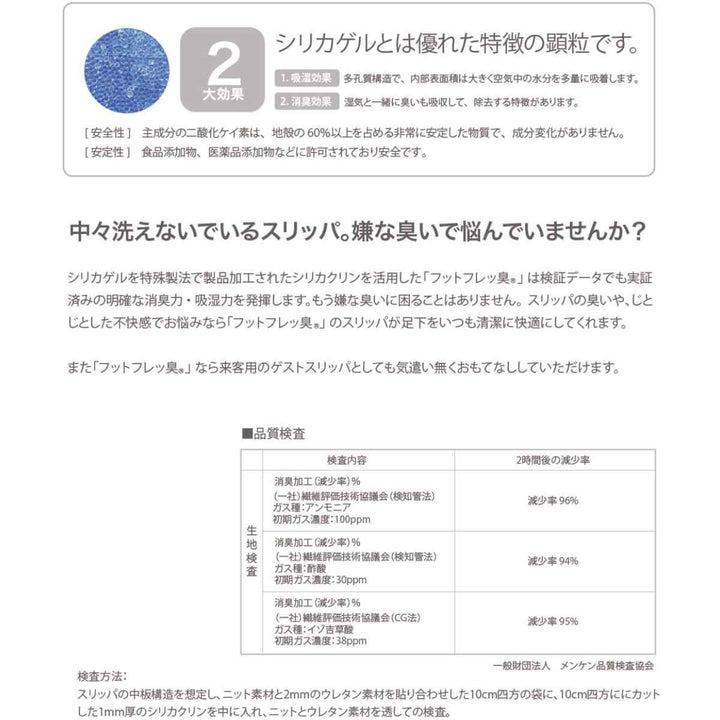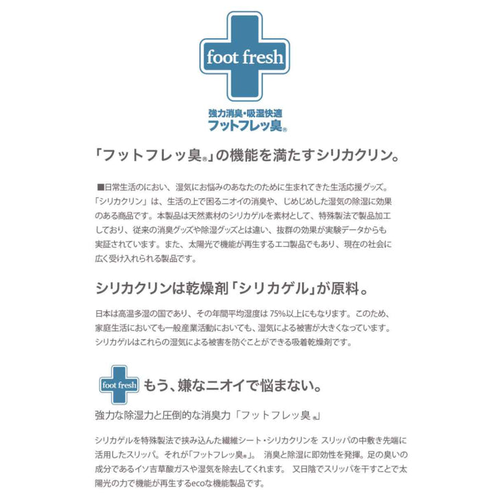 繊維シート「シリカクリン」がスリッパの中敷きや、つま先部分に入っているので、ムレの改善をしてくれます。また強力な消臭力と圧倒的な吸湿力で、足のニオイ成分を除去します。