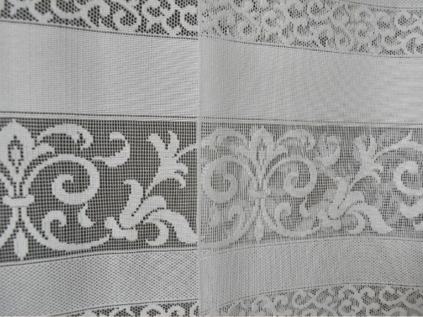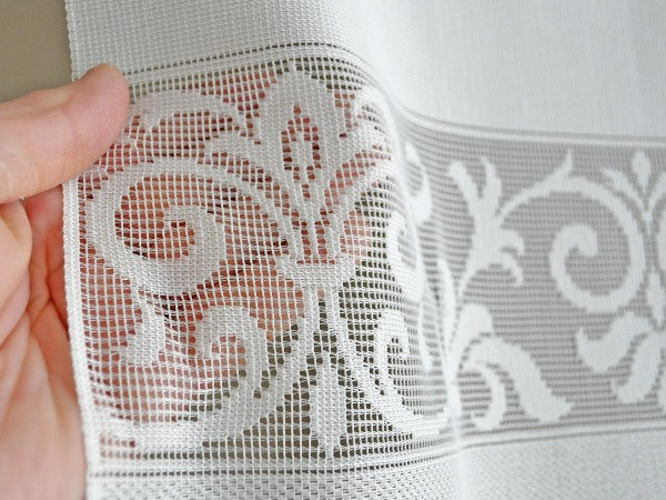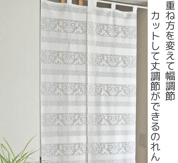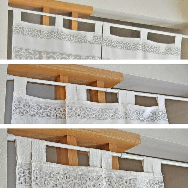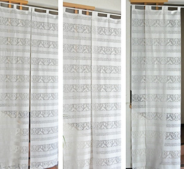 間口の幅などに合わせて2枚の重ね方を変えることで3段階の幅の調節を可能にした暖簾です。重ね方でレースの透け感も変わり、様々な表情でお部屋を演出します。