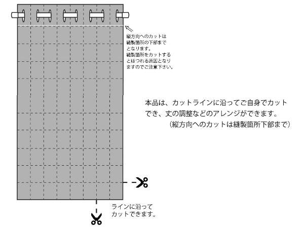 丈は嬉しいロングの250cmですが、ラインに沿って約10cmごとにカットできるのでお好みの丈にアレンジすることも可能です。縦にカットすれば、暖簾として使用することもできて便利です。