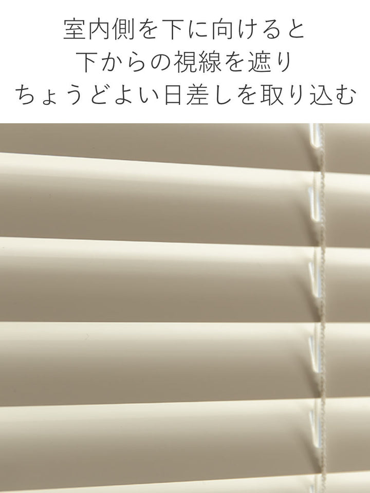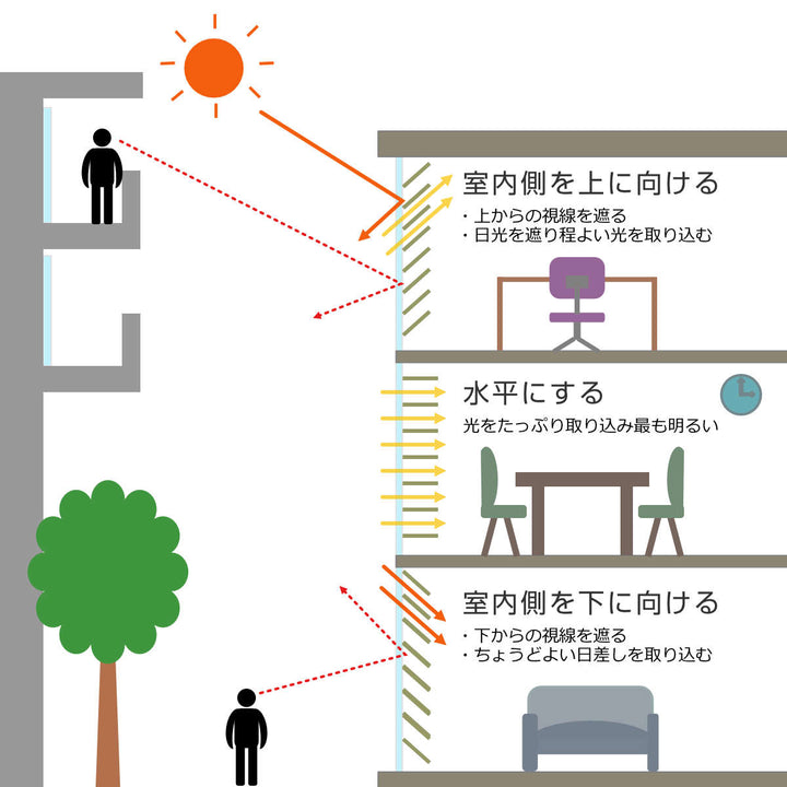 スラットを上に向けると真横や上からの視線と直射日光を遮ります。直射日光はスラットの傾きで反射しつつ、間接的な光が室内に入ります。光が拡散されることで光がやわらかくなり、部屋全体がふんわりとしたやさしい明るさになります。