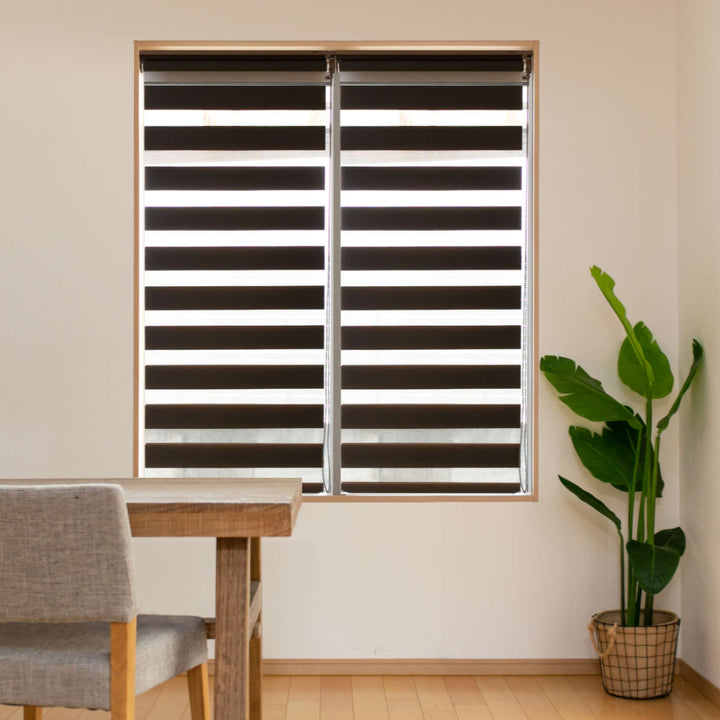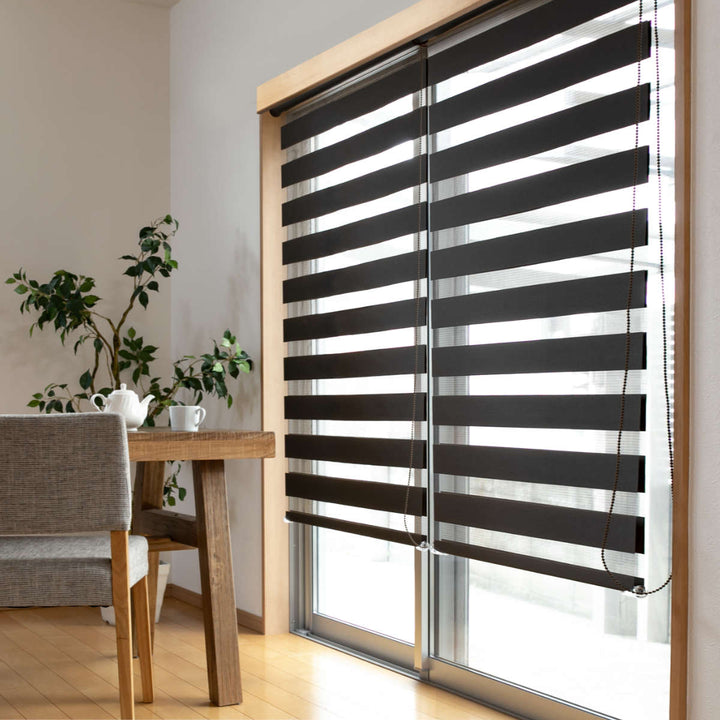 ボーダー柄のスクリーンが上下に交差することにより、光の量をコントロールすることが出来ます。スクリーンを降ろす時は奥側のボールチェーンを、スクリーンを上げる時は手前のボールチェーンを引くだけで簡単に操作が出来ます。