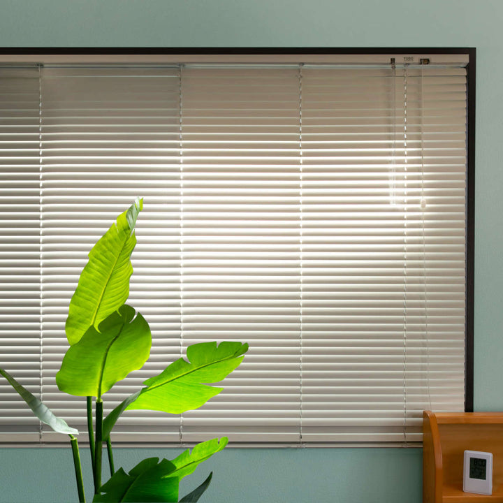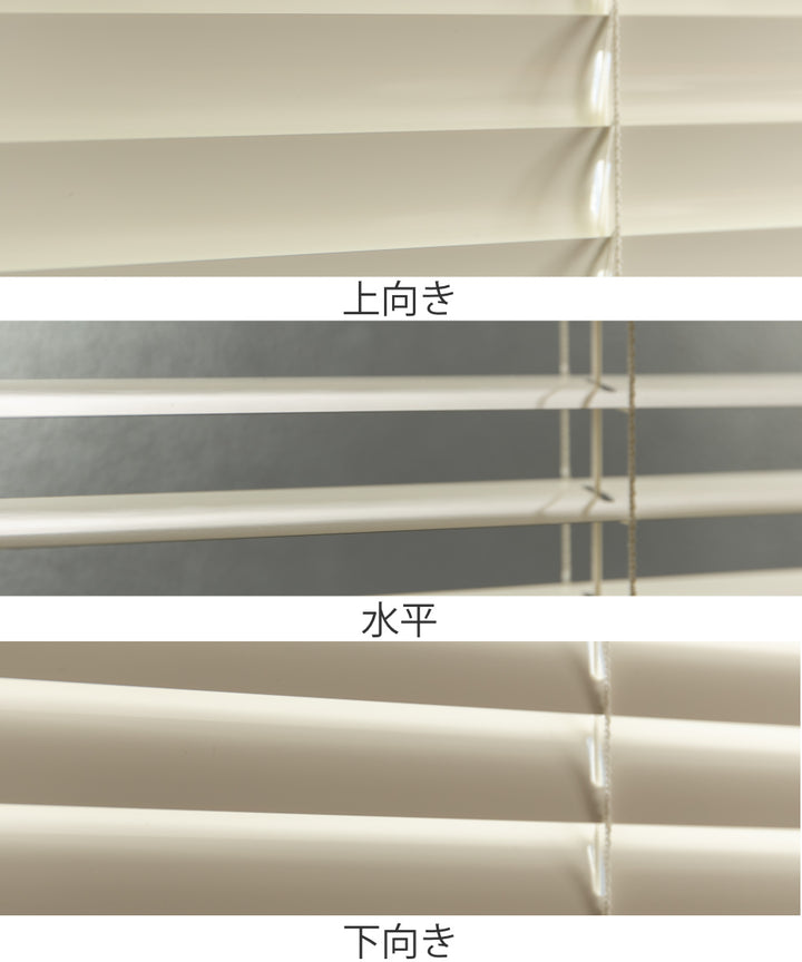ブラインドはスラットの角度によって日射を遮りながら風を通したり、外部の視線をコントロールする事ができます。室内側を上に向けると上からの視線を遮り、夏には強い直射日光を遮ります。室内側を下に向けると下からの視線を遮り、冬には丁度良い日差しを取り込みます。また、水平にすると光をたっぷり取り込むことができます。