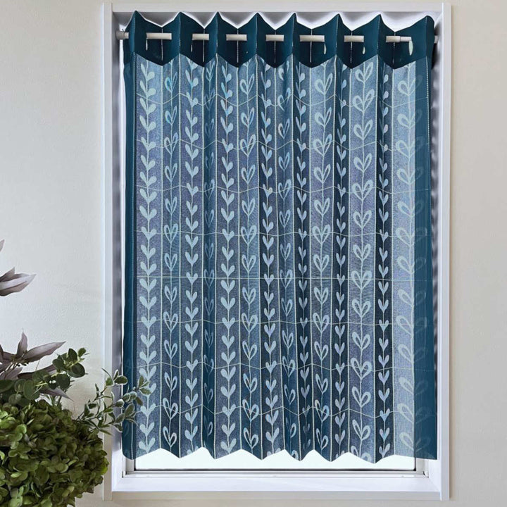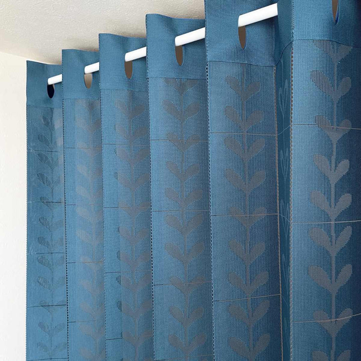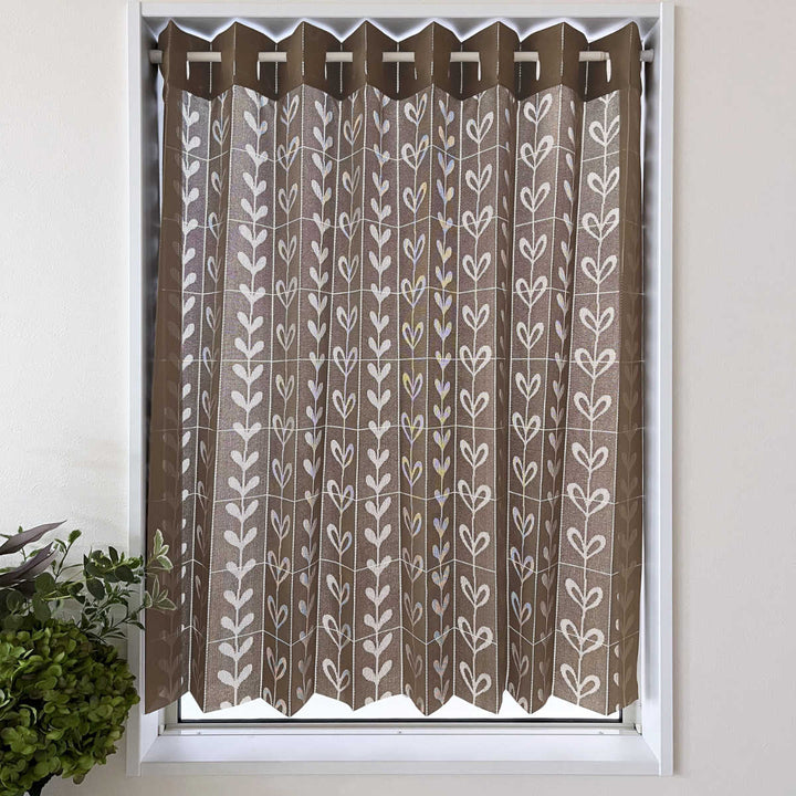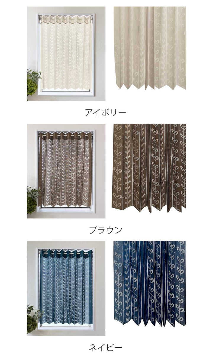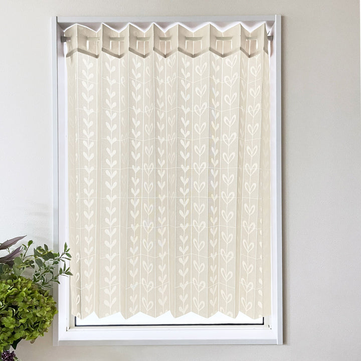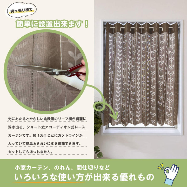 ナチュラルなリーフ柄がデザインされたアコーディオンカーテンです。お部屋に自然の風合いを加えながら、視線をさりげなく遮る役割も果たします。長さ100cmのため、小窓用カーテンとしてはもちろん、のれんや軽い間仕切りとしてもご利用いただけます。
