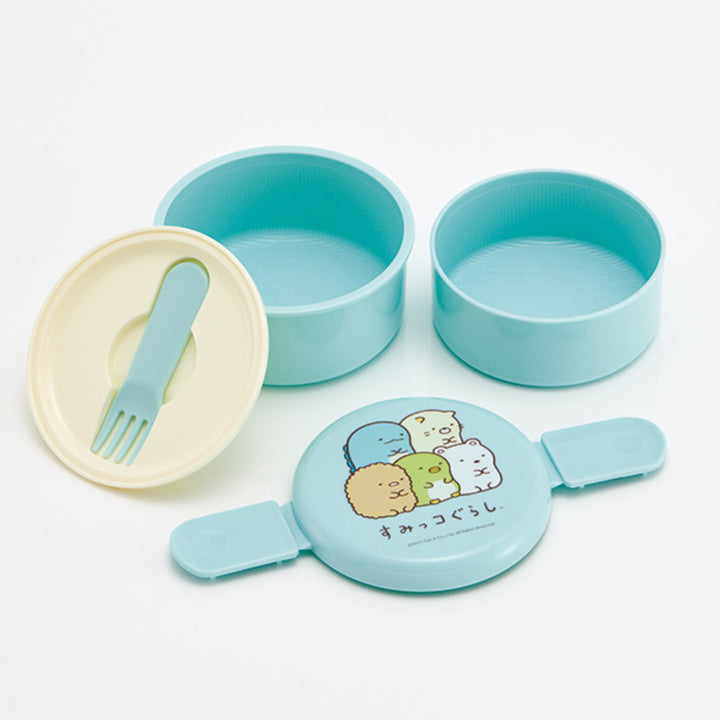 丸型のかわいい2段タイプのランチボックスです。プラスチック製のミニフォーク付きで別でカトラリーを持ち歩かなくても大丈夫です。食べ終わった後は、下段に上段を収納できる入れ子式で、コンパクトに持ち帰ることができます。