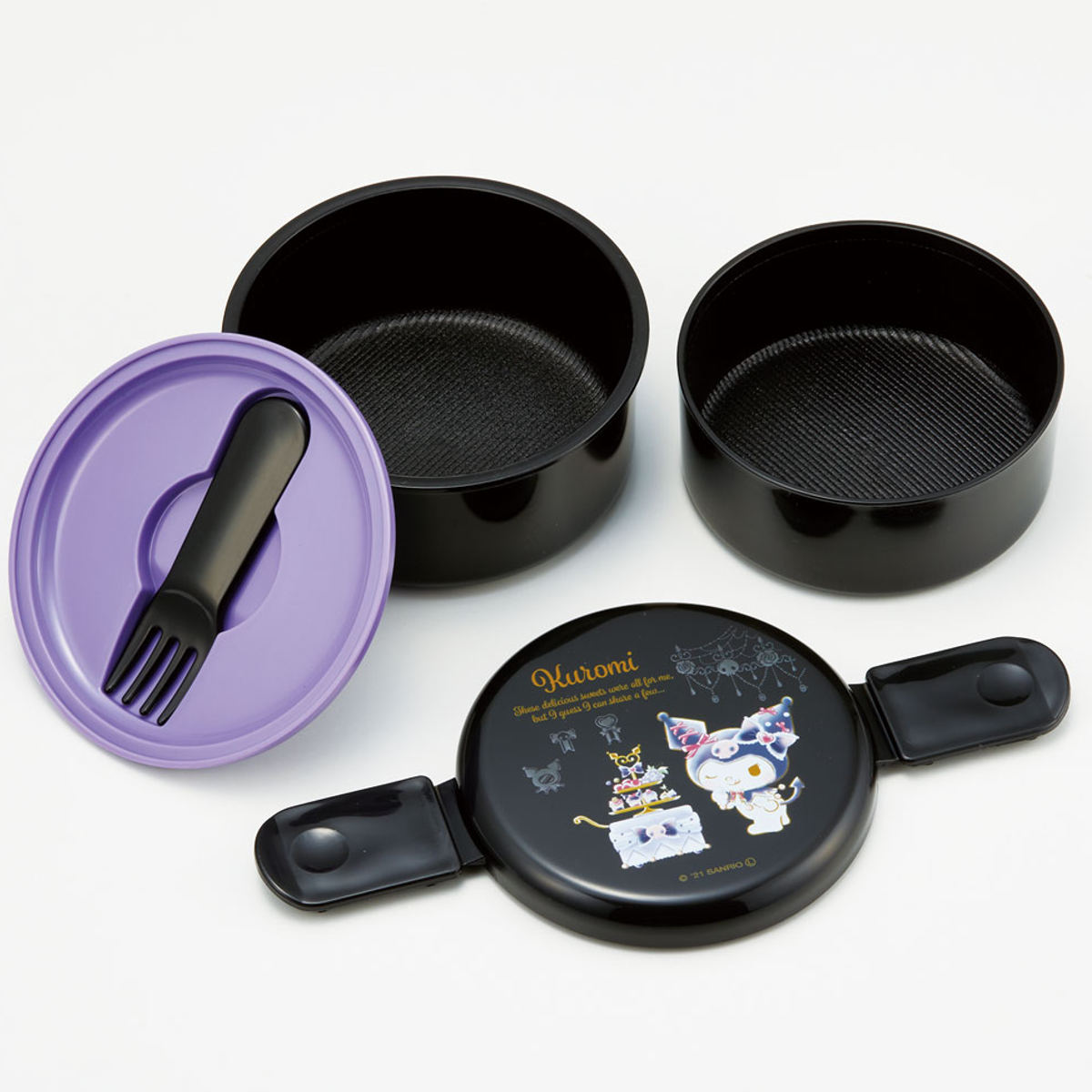 丸型のかわいい2段タイプのランチボックスです。プラスチック製のミニフォーク付きで別でカトラリーを持ち歩かなくても大丈夫。食べ終わった後は、下段に上段を収納できる入れ子式で、コンパクトに持ち帰ることができます。