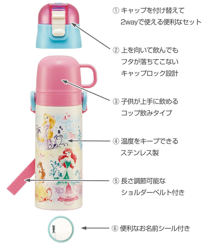 ●ディズニープリンセスの直飲みとコップ飲みを使い分けられる2WAYタイプのステンレスボトルです。