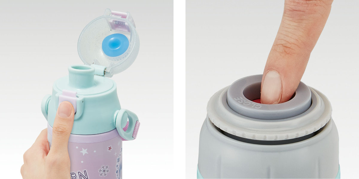 お手軽ワンタッチオープン直飲み・コップは両タイプともボタンを押すだけのワンタッチ方式です。シンプル操作で小さなお子様でも簡単に開閉できます。