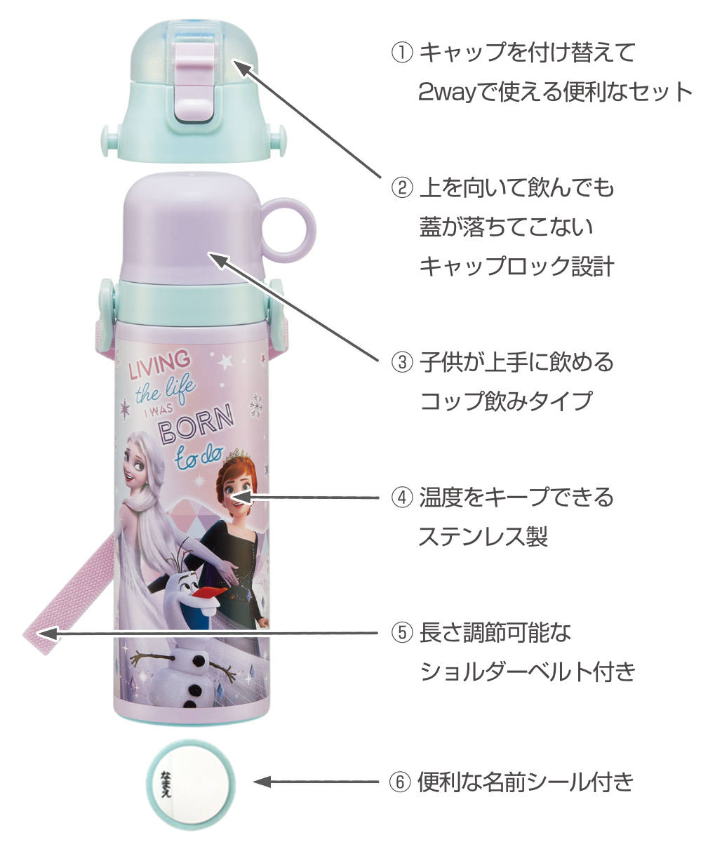 ●直飲みとコップ飲み、2通りの飲み方に対応したアナと雪の女王のステンレスボトルです。