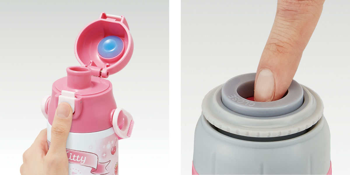 お手軽ワンタッチオープン直飲み・コップは両タイプともボタンを押すだけのワンタッチ方式です。シンプル操作で小さなお子様でも簡単に開閉できます。